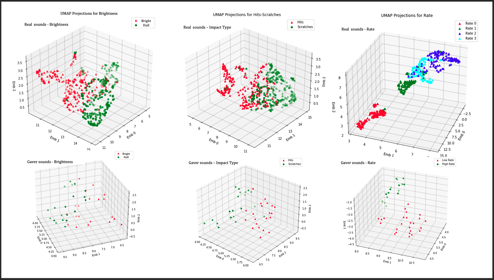 UMAP Clusters for Real and Synthetic Sounds based on semantic attributes